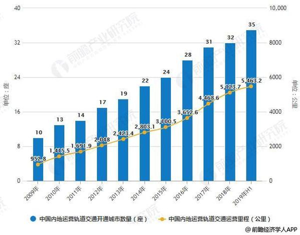 2009年,中国内地开通运营轨道交通的城市仅10座,运营里程仅952.8公里。截至2019年上半年,运营城市已达35座,包含地铁、轻轨、磁悬浮等系统在内,运营总里程激增至5463.2公里,开通城市数和运营里程在短短10年间分别增长了2.5倍和4.7倍。