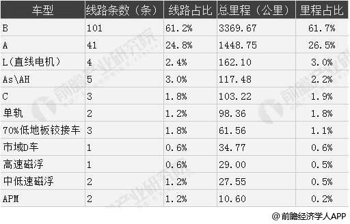 从车辆制式来看,截至2019年上半年,5463.2公里运营线路中11种制式同时在运营,其中A、B型车一直以来都是中国城市轨道交通的“主力军”,A、B型车运营里程占比达88.2%,线路数量占比达86.1%;其次,L(直线电机)162.10公里,占比3.0%,AsAH117.48公里,占比2.2%,其余占比均小于2%。
