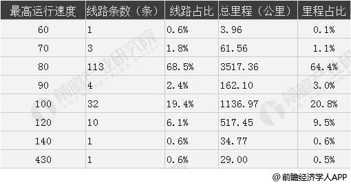 从线路最高运行速度上看,截至2019年上半年,在运行线路及运营里程中80、100和120这三个速度等级占有领先优势,运营里程占比分别为64.4%、20.8%和9.5%,线路数量占比分别为68.5%、19.4%和6.1%。