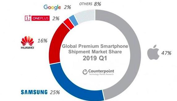 Counterpoint Research的报告显示,今年第一季度中国智能手机市场,售价在 600-800 美元价格区间(约合人民币 4100 元-5500 元),华为的市场份额达到了 48%,超过了苹果的 37%。但是,子在800 美元售价区间,苹果目前仍领先,市场份额达到了 74%,不过,华为份额已经从 2018 年的第一季度的 2%,提升至现在的14%。