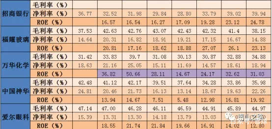 这里,用茅台对比11大行业的龙头,中国平安、海天味业、格力电器、伊利股份、恒瑞医药、长江电力、招商银行、潍柴动力、万华化学、中国神华、爱尔眼科。仍然是比较净利率、毛利率、净资产收益率这三项衡量盈利能力的关键指标。
