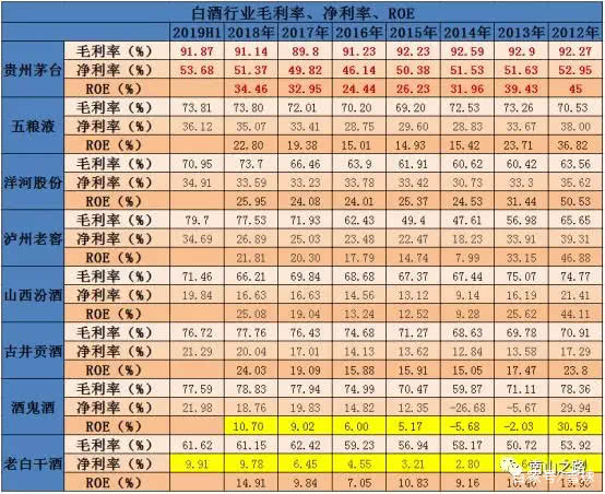 2018年11个龙头(去除平安、招行)平均毛利率为47.62%,平均净利率为21.34%,平均ROE为23.44%;再回顾一下白酒行业去掉茅台的7家主要企业,2018年平均毛利率72.71%、净利率22.97%、ROE为20.75%,有没有发现前者其实还不如后者?主要是毛利率水平差距巨大。