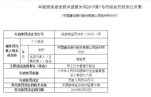 根据处罚信息表,建设银行抚州市分行因对员工行为管理不到位被罚款40万元。