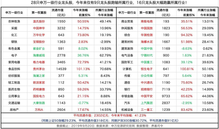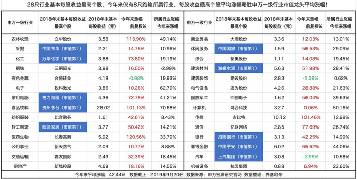 有位小伙伴看到“市值”和“EPS”两个重要因子,想来也是经过了一番深度思考后来问司令:那么如果挑选各个行业EPS最高的个股集合到一起,组合是否能够跑赢以最大市值方式集合到一起的龙头股组合?司令就喜欢用数据来说话,来来来,一起验证下。此处有mark,为了更客观对比,所以今年来数据截止时间均为2019年9月20日。