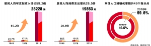 伴随着中国经济腾飞,城乡居民收入大幅提升,居民财富不断增长。1949年中国居民人均可支配收入仅为49.7元,2018年居民人均可支配收入达到28228元,扣除物价因素实际增长59.2倍,年均实际增长6.1%。2018年居民人均消费支出达到19853元,扣除物价因素实际增长28.5倍,年均实际增长5.6%。