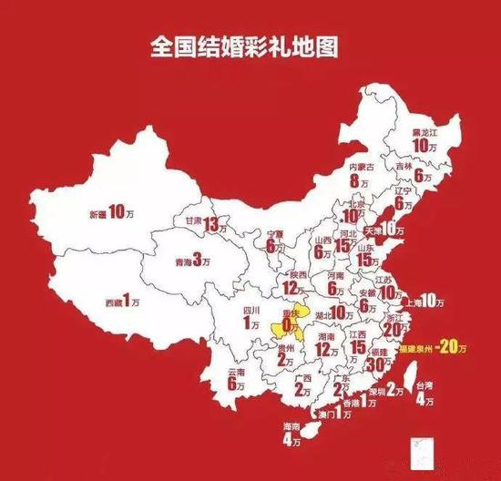 一幅全国彩礼地图显示,福建以30万彩礼位居第一,浙江以20万紧随其后,江西、山东、河北均为15万,并列第三。