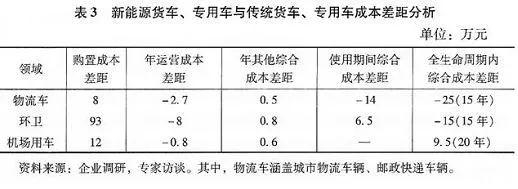 物流车辆以中轻型货车为主,按年行驶里程6万km计算,新能源物流车比传统车辆在10年运营年限内的综合成本节省14万元左右,在15年全生命周期内的综合成本节省25万元左右。 环卫车辆以重型货车为主,按年行驶里程 1万km计算,新能源车辆比传统车辆在12年运营年限内的综合成本高6.5万元左右,在15年全生命周期内的综合成本节省15万元左右。 机场用车以中型专用车为主,按年行驶里程 1万km计算,新能源车辆比传统车辆在全生命周期内的综合成本约高9.5万元(见表3)。 综上分析,公共服务领域的大部分新能源汽车车型已实现了使用期间和全生命周期内的经济性低于传统汽车,可引导全面电动化发展。