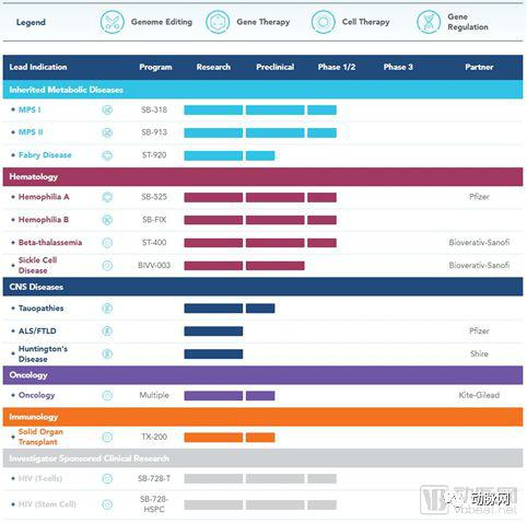 2018年5月,Sangamo和赛诺菲子公司Bioverativ合作开发治疗镰状细胞病的候选体外基因疗法BIVV003。同时Sangamo正与英国制药巨头Shire合作开发针对亨廷顿蛋白HTT的基因疗法,目前该疗法正在进行临床前研究,Shire将负责包括IND申请在内的临床开发活动。