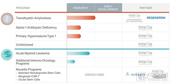 2016年4月,Intellia与Regeneron(再生元)公司达成了6年的合作协议,Regeneron向Intellia支付7500万美元预付款,并同意在Intellia下一轮股权融资时投资5000万美元。目前双方合作的针对转甲状腺素蛋白淀粉样变性(ATTR)研究产品处于临床前研发阶段。
