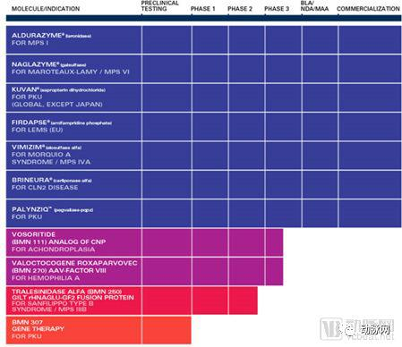 公司已上市的产品涵盖多种罕见遗传疾病的替代疗法,主要有治疗Morquio A综合征的Vimizim、治疗肌无力综合征的Firdapse、针对粘多糖贮积症VI(MPS VI)的Naglazyme、用于苯丙酮尿症(PKU)的Kuvan及用于粘多糖贮积症I(MPS I)的Aldurazyme。