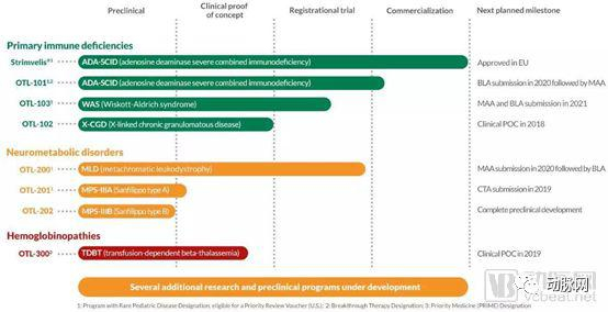 2018年,Orchard公司以19.9%的股份做交换,收购了GSK的罕见疾病基因治疗产品(包括OTL-200和OTL-103),囊括了已经EMA批准上市的体外基因治疗药物Strimvelis。目前公司管线包括对三类罕见病的药物研发: