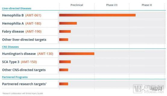 目前公司的产品围绕血友病、亨廷顿舞蹈症以及其他疾病。AMT-061是其在血友病和亨廷顿氏病的候选产品,使用载体的AAV5变体或血清型为载体,用于治疗B型血友病,目前正在进行Ⅱ/Ⅲ临床试验;另一产品AMT-130,利用公司专有的miQURETM沉默技术,其载体为携带人工微RNA(micro-