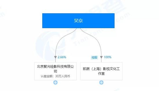 天眼查显示,吴京全资控股凯燃(上海)影视文化工作室,持有北京聚光绘影科技有限公司2.66%股权。其中,凯燃(上海)影视文化工作室拥有《战狼2》主要投资方之一的北京登峰国际90%股权。北京登峰国际法定代表人为吴燕,据悉其为吴京的姐姐。