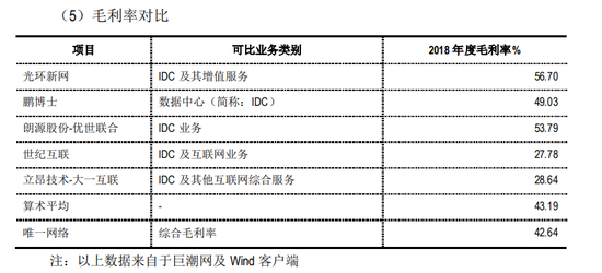 ①光环新网(300383),2018 年报中披露的 IDC 及其增值服务毛利率为 56.70%, 较唯一网络 IDC 业务毛利率高 14.06%;因光环新网拥有 7 个数据中心,机柜 30000 余个,其中主要来自自建机房,自建机房的优势在于正式投入使用后由于规模效 应,其固定机房折旧成本被摊薄,使其机柜成本降低。光环新网业务范围主要集 中在北京等一线城市,盈利能力较强,故其 IDC 及其增值服务毛利率在同行业中 较高。唯一网络 2018 年度无自有机房,全部为租赁机房,且客户群体主要集中 在东莞、厦门等二线城市,故综合毛利率较光环新网稍低。