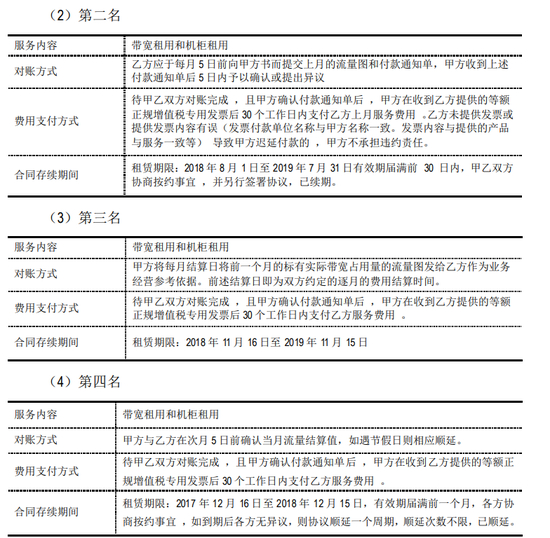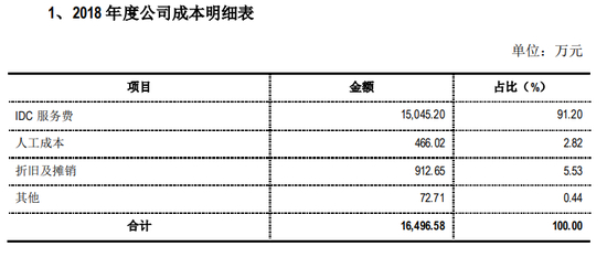 (4)2018 年度,唯一网络提供 IDC 服务主要通过租赁运营商的机房实现, 无自建机房,提供 IDC 服务的资源成本,通过向各电信服务供应商租赁,所以不存在单独的电费、房租成本。