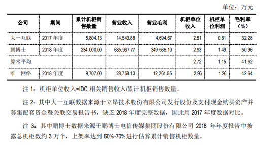 由上表可知,2018 年度唯一网络公司机柜单位收入、单位毛利高于大一互联 公司 2017 年度数据,单位收入与鹏博士公司相近,而毛利率低于鹏博士。与同 行业可比公司对比,唯一网络 2018 年度机柜单位收入、毛利率符合行业水平。