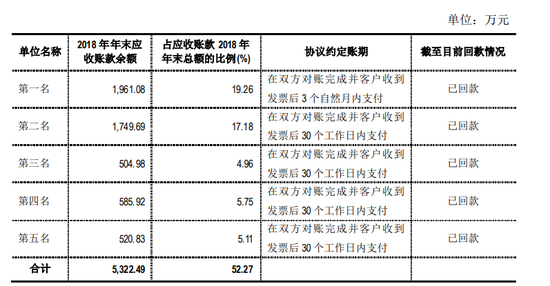 3、唯一网络 2018 年前五大客户应收账款期后回款情况如下: