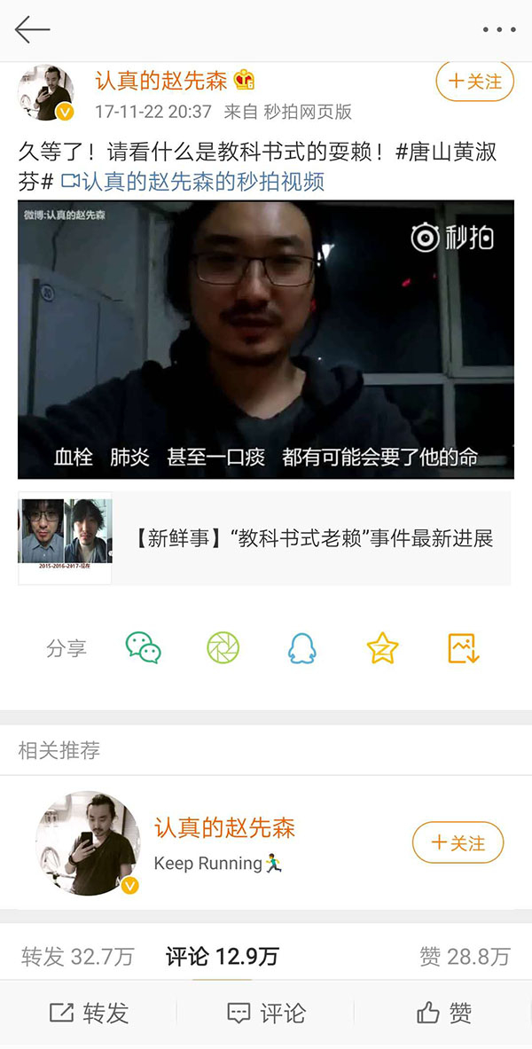 这段视频至今被观看1亿人次,评论12.8万,转发32.8万,很多网络大V也进行了转发,声援赵勇。