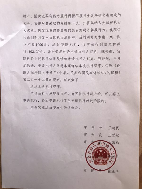 6月14日,唐山市中级人民法院在执行到11.4万元后,终结了此次执行程序。