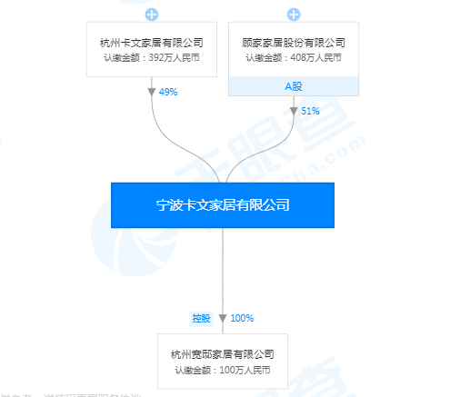 我们通过天眼查发现,这家宁波卡文公司成立于2018年1月。从股权结构来看,宁波卡文家居公司直接控制着杭州宽邸家居100%的股权,而他的股东则为顾家家居和杭州卡文家居有限公司,其中的杭州卡文家居的法人为赵婉欣。