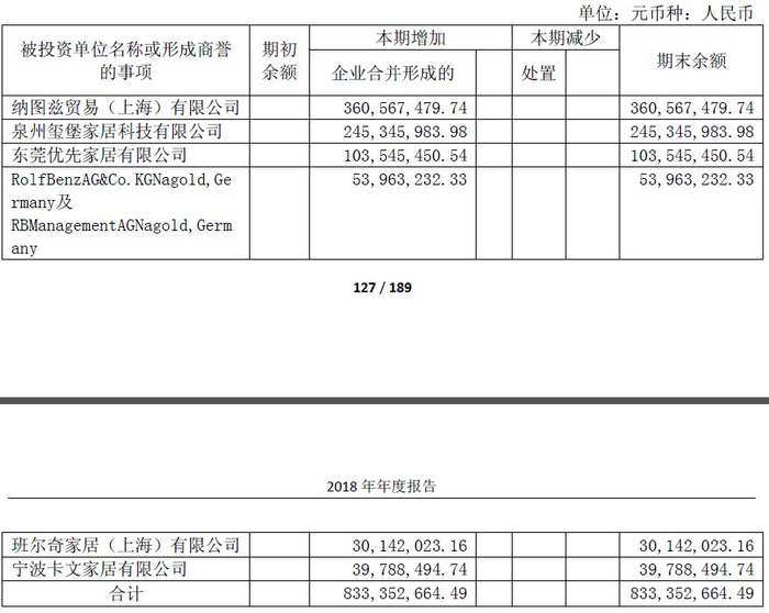 具体来看,在顾家家居8.33亿元的商誉中,并购纳图兹(上海)形成商誉3.61亿元;并购玺堡家居形成商誉2.45亿元;并购优先家具形成商誉1.04亿元。