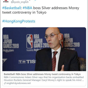 10月7日,正在日本参加活动的NBA总裁亚当·肖华(Adam Silver)接受记者采访,回应了休斯顿火箭队总经理莫雷发表涉港不当言论引发的风波。肖华承认该事件已经对NBA造成了明显的经济影响,但他同时声称,虽然不为莫雷推特内容背书,但支持莫雷的“言论自由”。