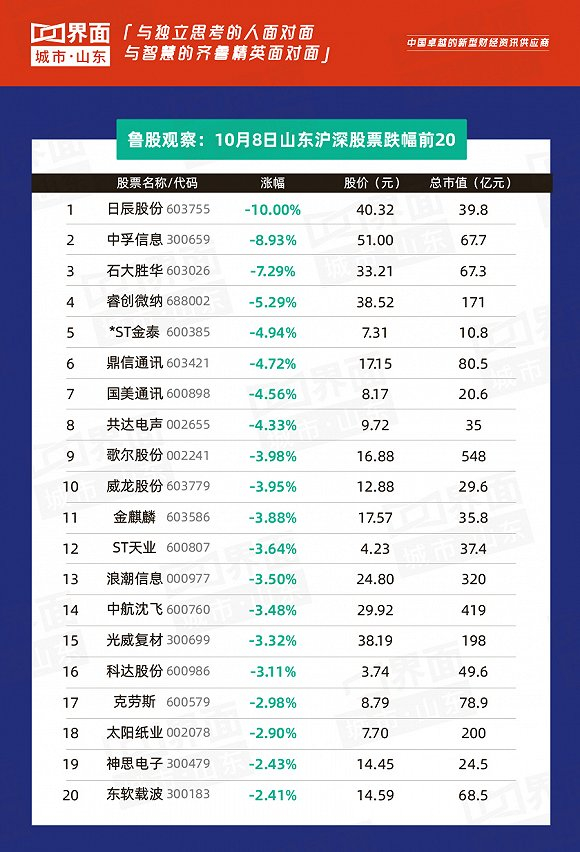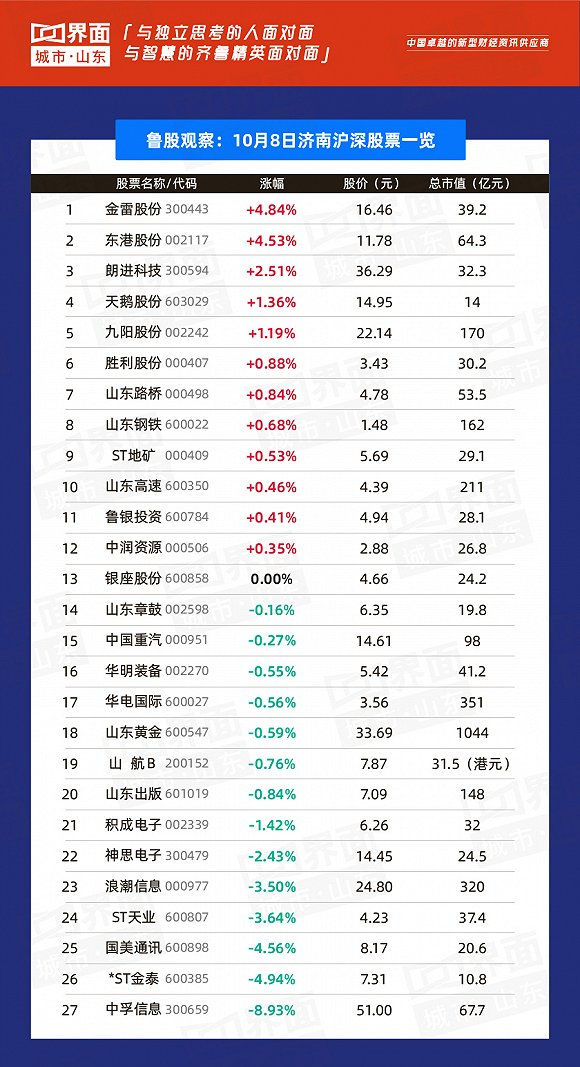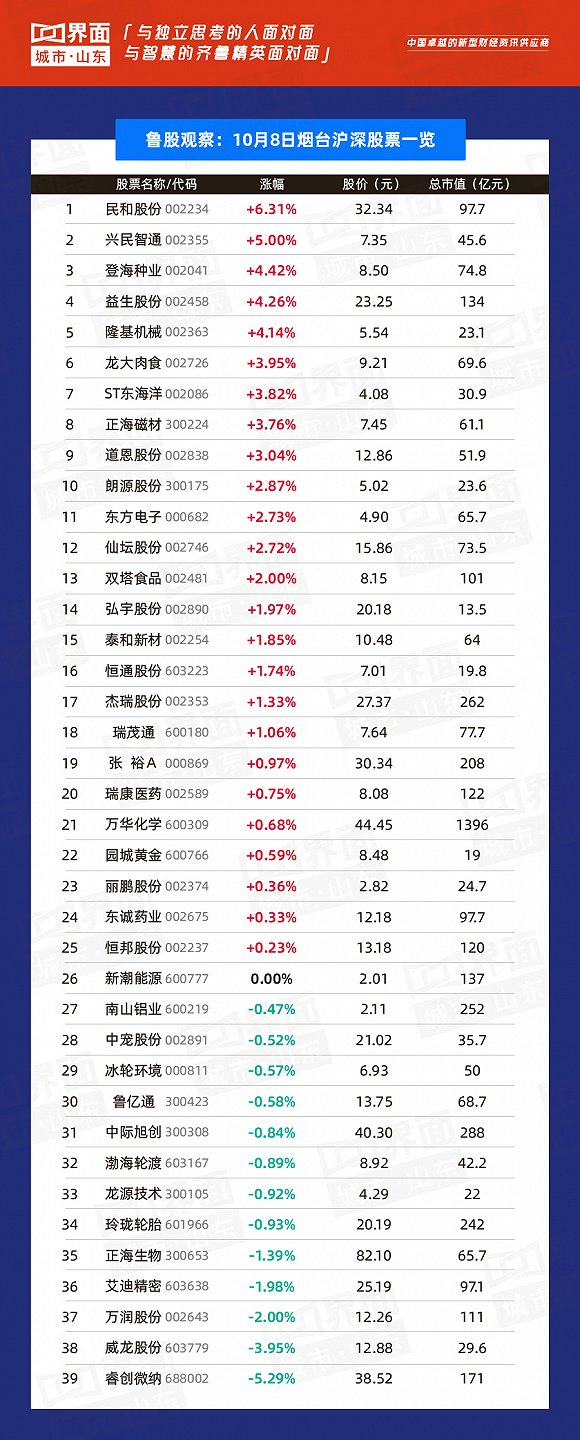 10月8日,山东省内沪深股票有109只个股上涨,83只下跌,14只与上一个交易日收盘价持平;