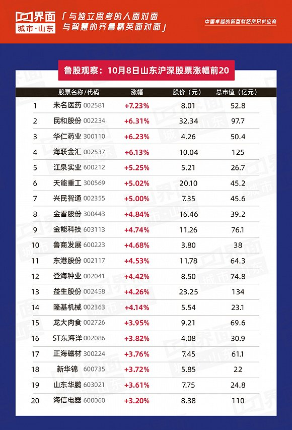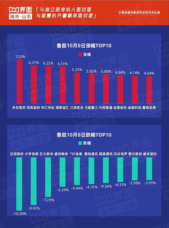 【鲁股观察】10月8日 109只个股上涨,淄博未名医药领涨全省