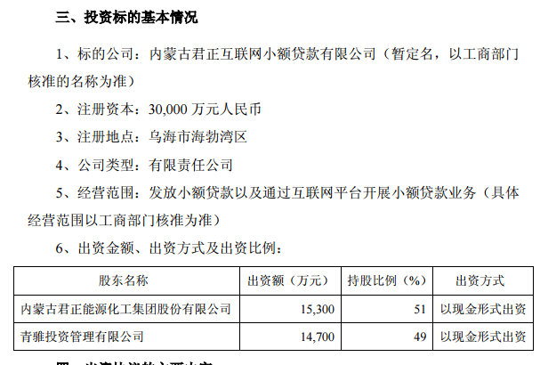 公告显示,拟设立网络小贷公司的注册资本为3亿元,其中君正集团以现金形式出资1.53亿元,占拟设立公司注册资本的51%;青骓投资管理有限公司出资1.47亿元,出资比例为49%。注册资本为三亿元,注册地位乌海市勃湾区。