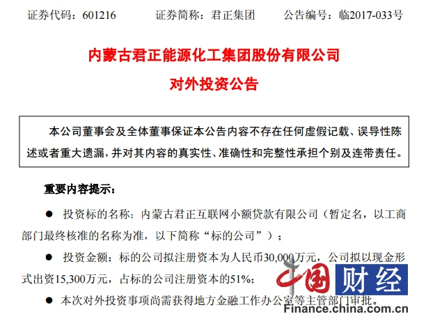 中国网财经5月23日讯(记者 毕晓娟) 昨日,内蒙古君正能源化工集团股份有限公司(601216.SH,简称君正集团)发布对外投资公告(以下简称公告),称拟出资1.53亿元发起设立内蒙古君正互联网小额贷款有限公司(暂定名)。目前该投资事项还需获得地方金融办审批。