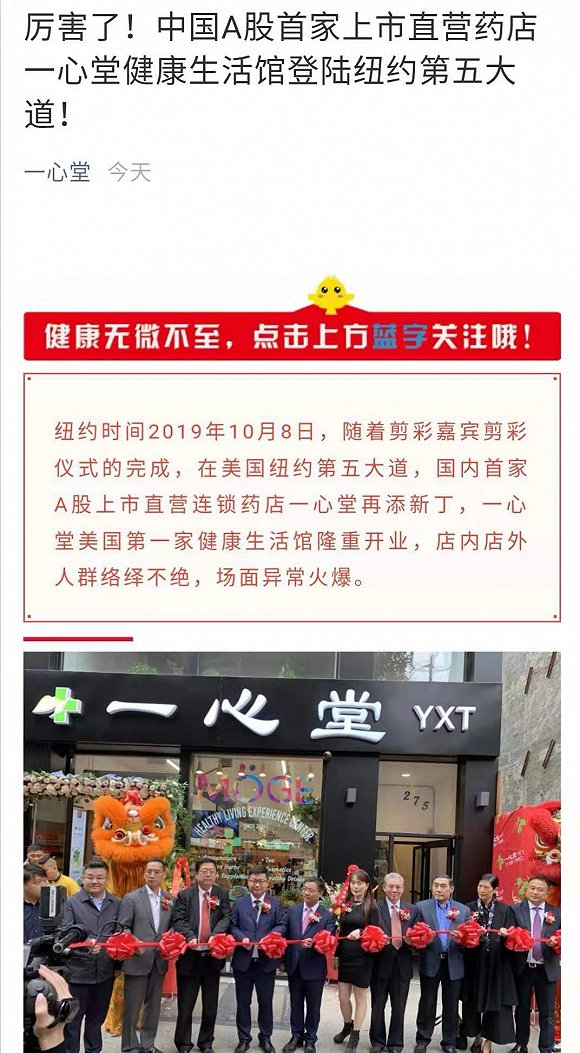 根据一心堂官微今天的推送文章,纽约时间10月8日,一心堂在美国第一家健康生活馆“隆重开业”。