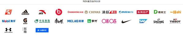据了解,目前涉及NBA中国合作伙伴共分两部分,一是NBA的官方合作伙伴。据NBA中国官网显示共有27家,分别为2K、阿迪达斯、安踏、Beats by Dr.Dre、长虹、芝华士、清扬、携程、东风日产、德克士、一嗨租车、埃克森美孚、佳得乐、哈尔滨啤酒、中宏保险、康师傅、美菱、蒙牛、中国移动咪咕、耐克、思爱普(SAP)、斯伯丁、天梭、安德玛、vivo、吾尊、小赢科技。