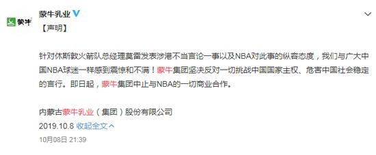 随后,多家中国企业陆续发声宣布暂停NBA合作。