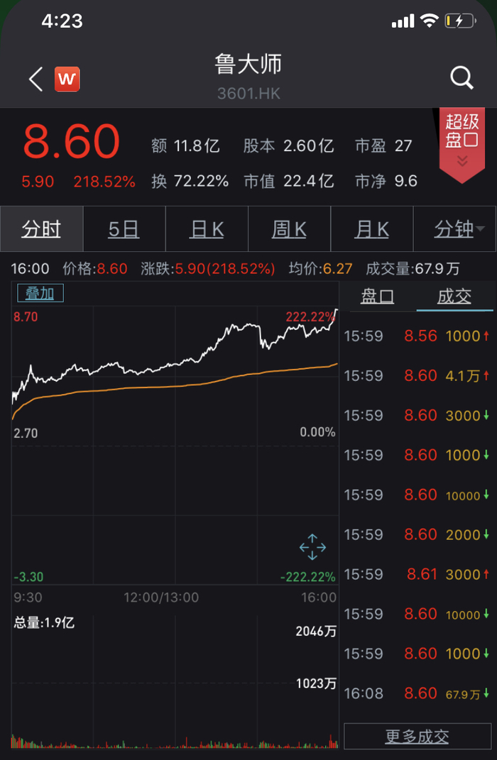 上市首日,鲁大师股价一度暴涨222.22%,截至下午收盘,鲁大师报8.6港元。较之2.7港元的发行价格上涨了218.52%,对应市值22.4亿港元,约合20.3亿元人民币。