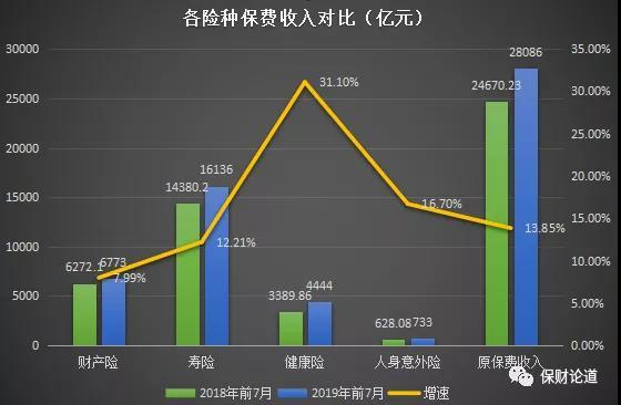 与此同时,近年来,在保险行业转型并一度经历阵痛的过程中,健康险业务渐成“清流”,更令业内人士誉为“保险回归保障”的标志成果。2019年前7月,健康险保费收入4444亿元,涨幅高达31.1%,遥遥领跑其余险种。