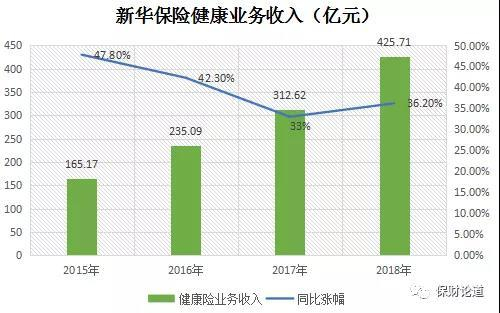 来看转型结果,2016年,新华保险健康险业务收入235.09亿元,同比上涨42.3%。此后两年,新华保险健康险业务同比涨幅保持在3成以上,2018年末,健康险业务收入425.71亿元,2019年上半年,健康险业务收入同比涨幅25.9%。