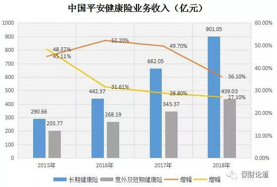2018年,中国平安长期健康险业务收入从2017年662.05亿元上涨至901.05亿元,涨幅36.1%,意外及短期健康险保费收入439.03亿,增幅近3成。仅从数据来看,2019年上半年,中国平安长期健康险、意外及短期健康险保费收入均已超过2016年全年数值,分别达到546.89亿元、275.7亿元。