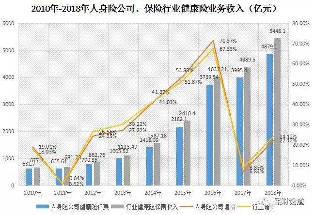 自2012年起,人身险公司健康险保费收入即驶入“快车道”,增幅逐年上扬,从个位数的涨幅到两成、三成,2016年更将近七成,涨势可观。2018年,人身险公司健康险业务收入已达到4879.1亿元,而在2010年,这一数值仅为631.7亿元,期间涨幅高达672.38%。