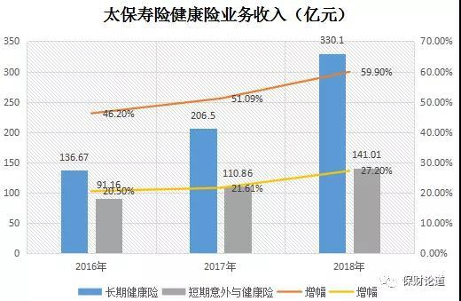 目前,太保集团通过太保寿险和太保安联健康险双向推进健康险业务布局。先来看太保寿险健康险业务的表现,2017年至2019年上半年,其健康险业务收入同比增幅保持在5成以上,涨势可观。数据显示,2018年,中国太保长期健康险保费收入330.1亿元,同比增幅59.9%,短期意外及健康险141.01亿元,体量规模同样可观;2019年上半年,长期健康险保费收入277.17亿元。