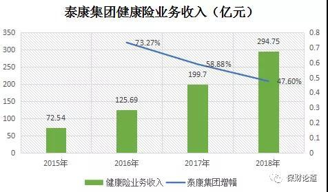凭借健康产业链的搭建与完善,泰康集团健康险业务快速发展,2016年健康险保费收入125.69亿元,同比上涨73.27%,超过行业同比67.33%的涨幅。2017年、2018年,泰康集团健康险业务收入分别为199.7亿元、294.75亿元,保持将近50%的增长速度,超过同期人身险公司及保险行业的健康险保费增幅。