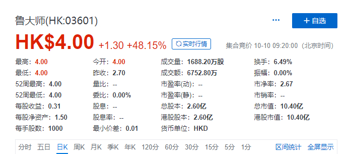 除超额认购外,投资者们对这只股票充满了热情。上市前夜,10月9日暗盘交易已经热情高涨,收涨52.22%,报4.11港元,堪称2019年最火爆的港股之一。