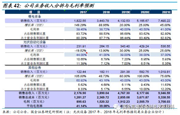 根据公司公告,我们将公司产品分为锂电设备、光伏自动化设备、其他设备与配件业务,基于以下假设对公司主要业务的收入与毛利率进行预测。