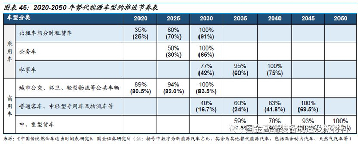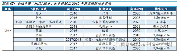 中国将新能源汽车发展作为重要战略方向,先后多个规划文件提出新能源汽车发展目标:到2020年纯电动汽车和插电式混动汽车的生产能力达到200万辆,占比6%-7%;到2025年新能源汽车总销量达500-700万辆,占比15%-20%;到2030年新能源汽车总销量1500万辆,占比达40%。根据2019年5月能源与交通创新中心发布的《中国传统燃油汽车退出时间表研究》,我国传统燃油车将于2050年退出市场。