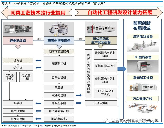 成立之初,公司通过开发用于薄膜电容器制造的成套自动化设备,掌握了自动卷绕技术、高速分切技术等核心制造技术。凭借技术的通用性与长期积累的自动化工程研发设计能力,公司将业务领域拓展至锂电、光伏、3C检测等,形成一个技术互通、生产设备共用的非标自动化设备“能力圈”,成为智能装备整线生产龙头。