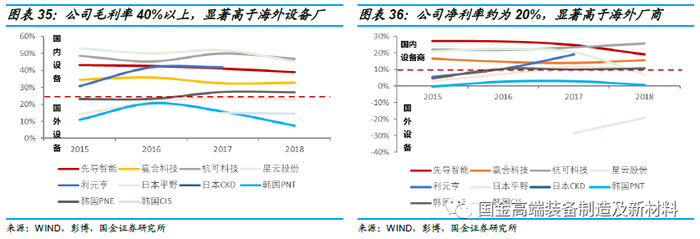 公司的收入规模不断扩大,已显著拉开与国内及日韩竞争对手的差距。2015年至2018年,公司收入规模由5亿元快速提升至近40亿元,远超国内外设备厂商,几乎是第二大收入规模厂商的2倍。同时,得益于人工成本低、成本管控能力好,公司盈利能力相比日韩厂商强,历年毛利率维持在40%以上的水平,相比日韩设备厂商高约20pct;净利率维持在20%的水平,显著高于日韩厂商7%至10%的毛利率水平。