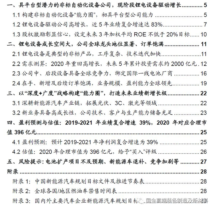 2)我们认为,公司是全球锂电设备龙头,将显著受益于下游电池厂商扩产浪潮。同时,公司以“深度+广度”战略布局光伏设备、燃料电池设备、半导体设备、智能物流等业务,已初步具备平台型公司价值,相比于业务较单一的设备厂商,应享有一定的估值溢价。我们采用分部估值法,给予公司综合PE 30倍,2020年合理市值396亿元,6-12个月目标价45元。首次覆盖,给予“买入”评级。