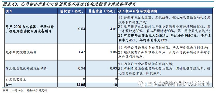 公司拟公开发行可转债募集不超过10亿元投资于“年产2000台电容器、光伏组件、锂电池自动化专用设备项目”、“先导研究院建设项目”与“信息化智能化升级改造项目”等。其中,自动化专用设备项目生产线建成后,第一至三年生产设备数量预计为60%、90%和100%,可实现年均收入24亿元、年均净利润5亿元,保障公司产能充足与业绩可持续增长。2019年8月30日,公司公开发行可转债申请获得证监会审核通过。