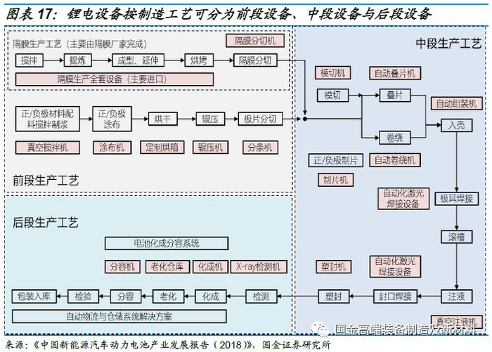 锂电池前段生产工艺对应的设备包括真空搅拌机、涂布机、辊压机等,中段生产工艺所使用的设备主要是模切机、叠片/卷绕机、真空注液机;后段生产工艺对应检测机、化成机与分容机。各工序中的关键设备对锂电池的一致性、安全性等有决定性影响。