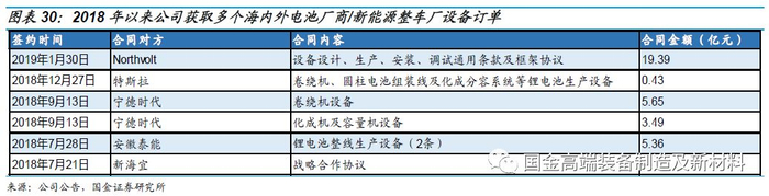 2018年以来,公司先后获取了安徽泰能、宁德时代、特斯拉以及Northvolt的大额订单及框架合作协议。根据公司公告,2018年大额订单总计近15亿元,2019年仅与欧洲新电池厂商Northvolt签订了近20亿元的设备大单,后续经营发展有保障。