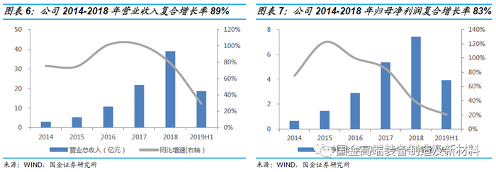 近年来,在锂电设备业务驱动下,公司营业收入、归母净利润增长快速,2014年至2018年的复合增长率分别为89%、83%;2019年上半年,公司实现营业收入18.6亿元、归母净利润3.93亿元,同比增长29%、20%。